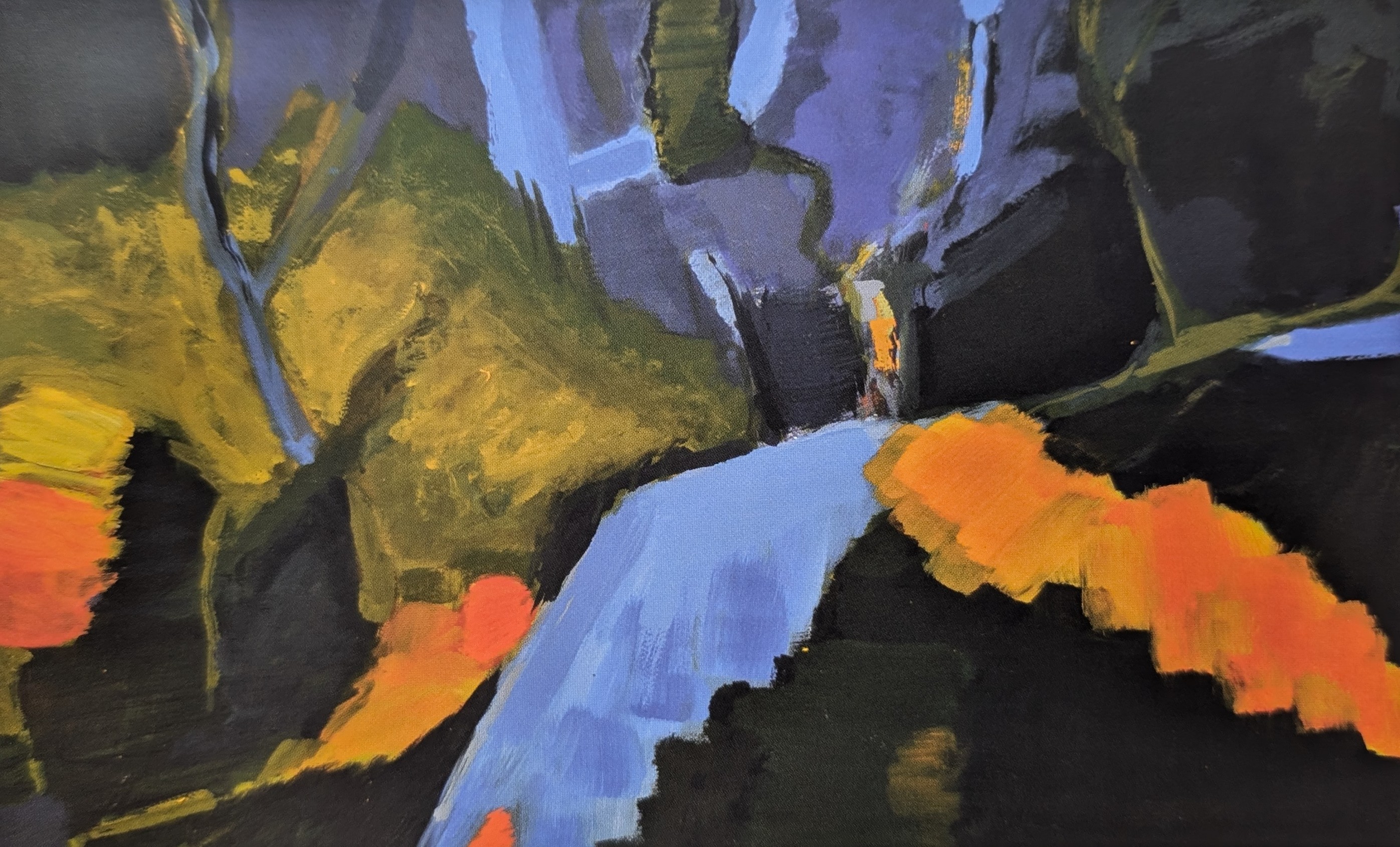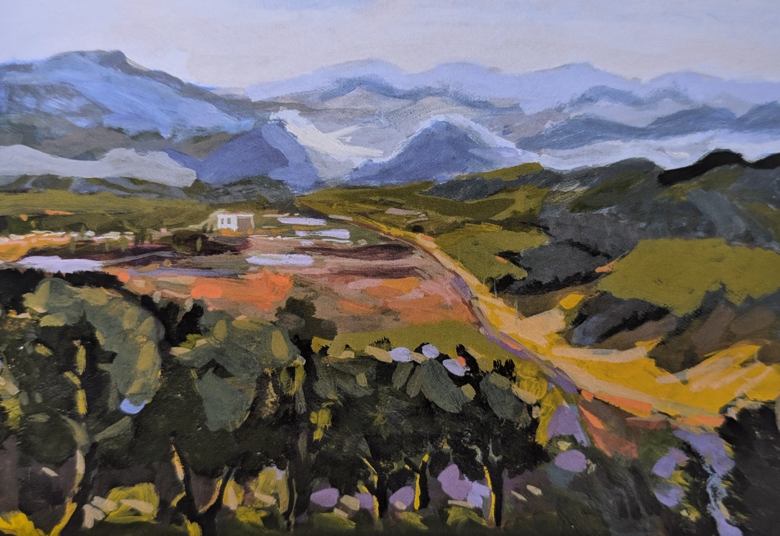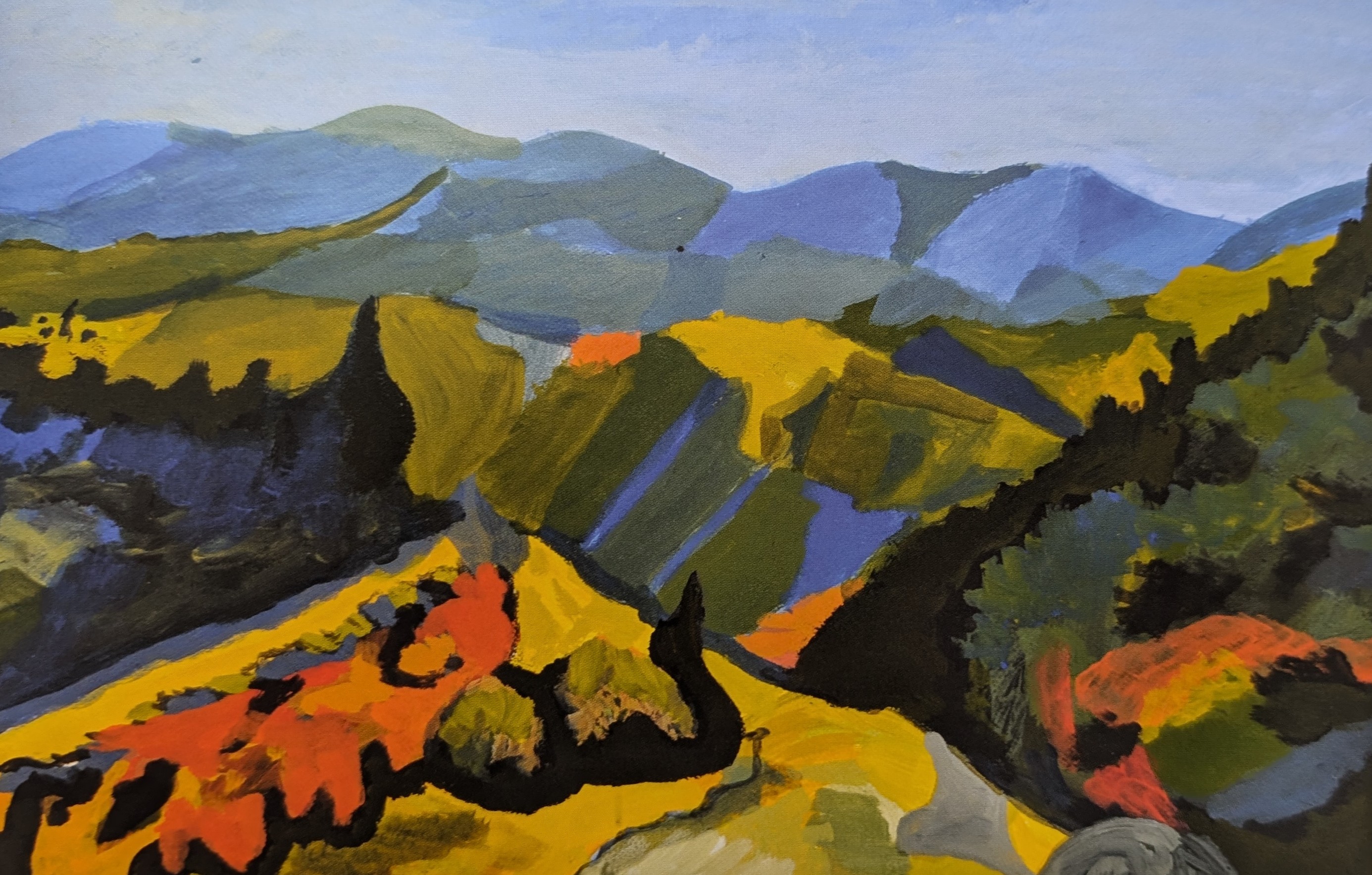 Exhibited also at the "Óyeme con los ojos" exhibition in 2015, this vibrant piece titled "Autumn Reverie" uses bold, contrasting colors to depict the dynamic interplay of light and shadow in a hilly landscape, evoking the warmth and vibrancy of an autumn day.