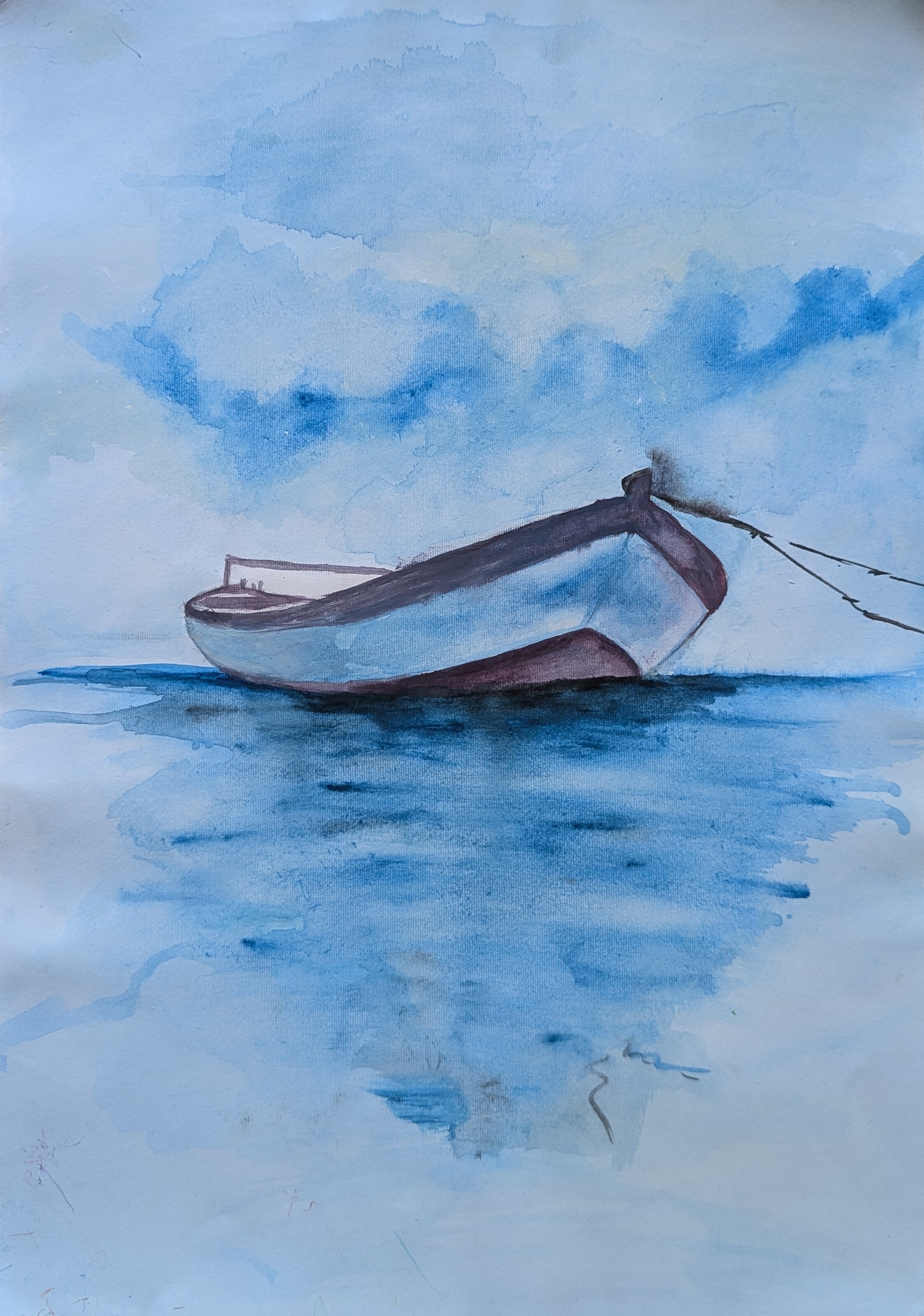 "Solitude at Sea" depicts a lone boat gently anchored in calm waters, surrounded by tranquil shades of blue that evoke a sense of quiet reflection and serenity, capturing the stillness of a peaceful moment at sea.