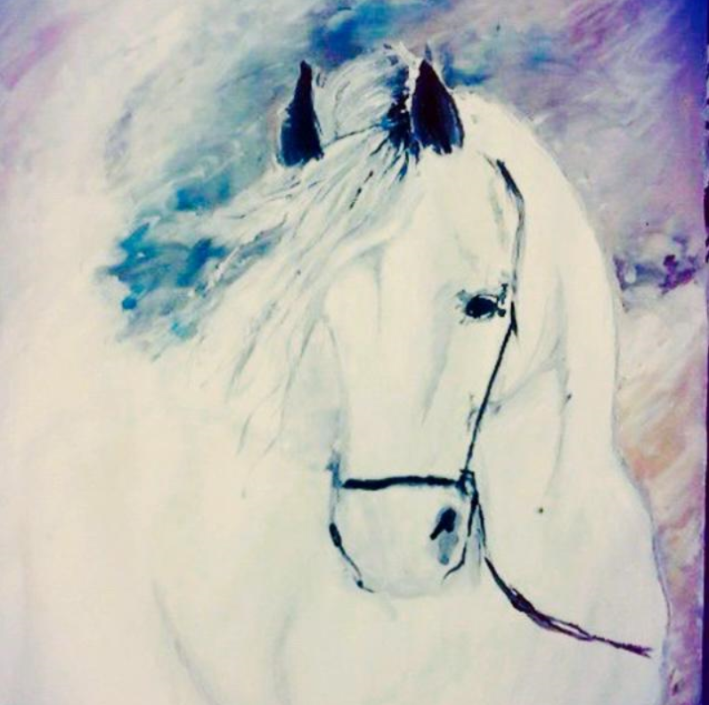 Awarded 1st place at the "Le Salon du Cheval d'El Jadida" in 2017, "Majestic Grace" captures the ethereal beauty and strength of a white horse, with soft brushstrokes and delicate shades of blue and purple that evoke a sense of movement and elegance, reflecting the spirit of this noble creature.