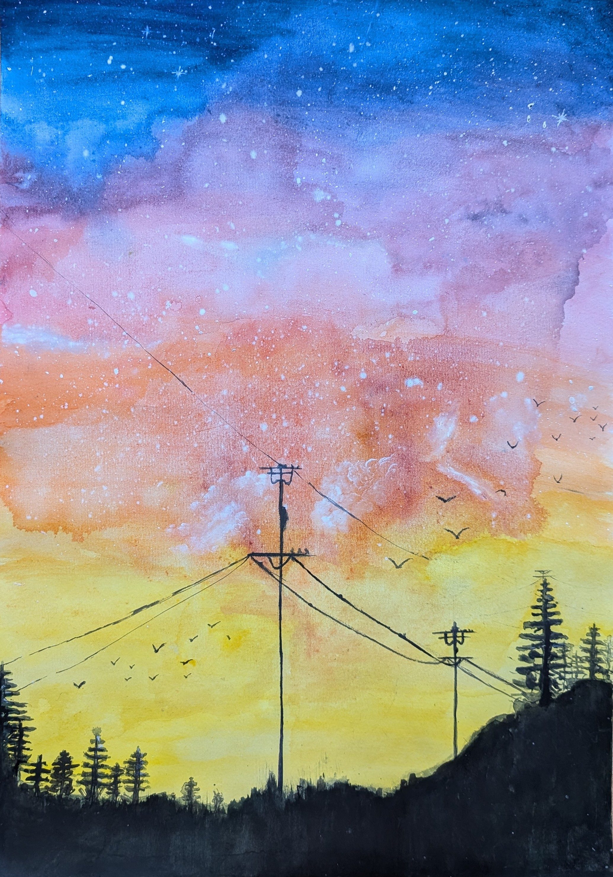 "Whispers of Dusk" captures the quiet beauty of the sky transitioning from day to night, with delicate hues of pink, yellow, and blue blending together. The silhouetted power lines and trees add a sense of calm and stillness as birds glide across the peaceful evening sky.
